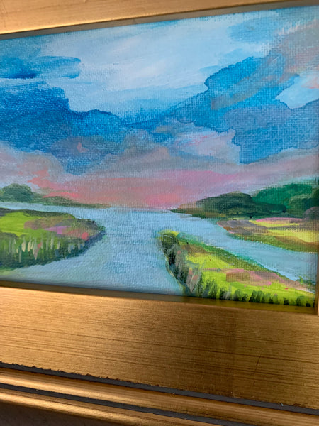 Acrylic 5x7 marsh framed in a 10x12" wide gold frame. Ready to hang.