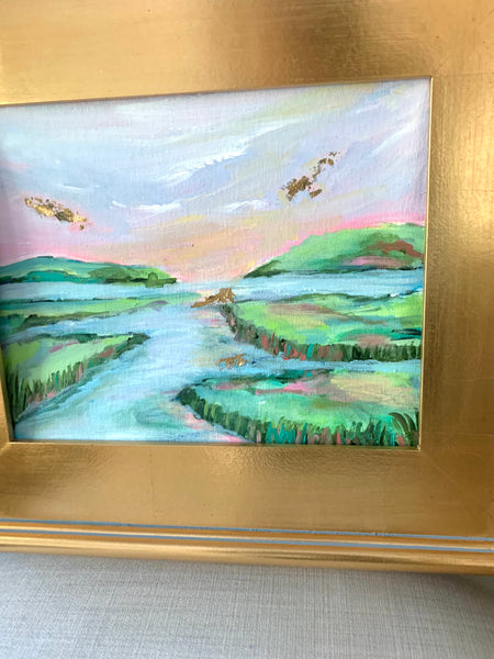 Colorful 8x10 marsh with gold leaf sparkle is framed in a 14x17" wide gold frame.
