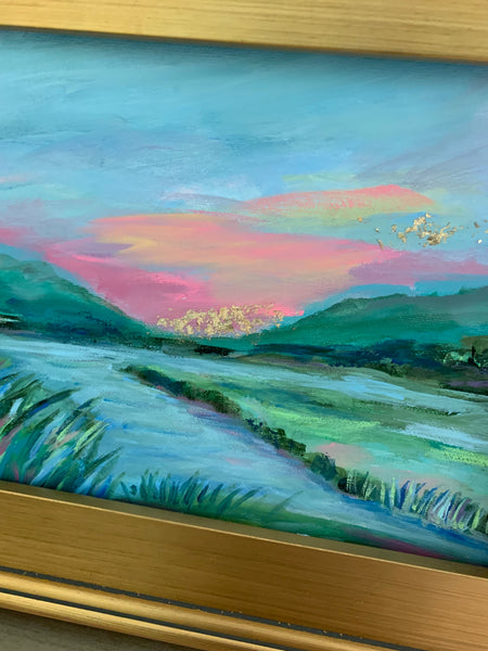 This marsh painting titled "At the Edge" shows a gorgeous pink sky over the marsh. Accents of sparkling gold leaf, The 8x10 painting is framed in a 13x15" wide gold frame. Ready to hang.