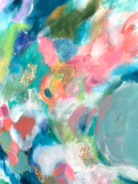 Shades of blue and pink highlighted in this 16x20 abstract. Accents of gold leaf. This stretched canvas can hang unframed.
