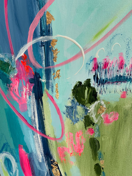 18x24" abstract expresses movement in shades of navy, greens and pinks. Accented with gold leaf and oil pastels. Sides are painted so it can hang unframed.
