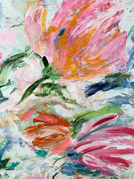 18x24" flowers painted with a palette knife. Thick paint and lots of texture. The stretched canvas has painted sides so it can hang unframed.