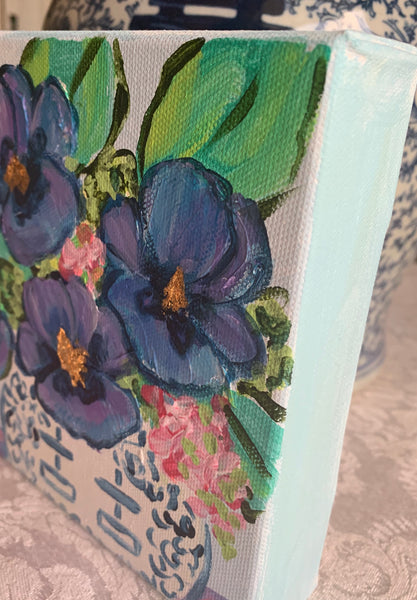 6x6" standup mini painting of vibrant blue pansies. It can hang or stand up on a shelf.