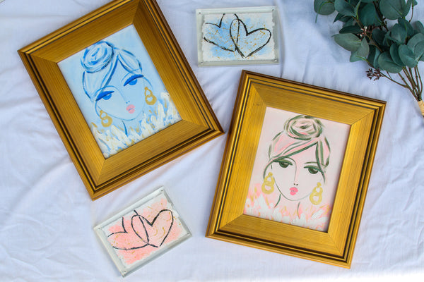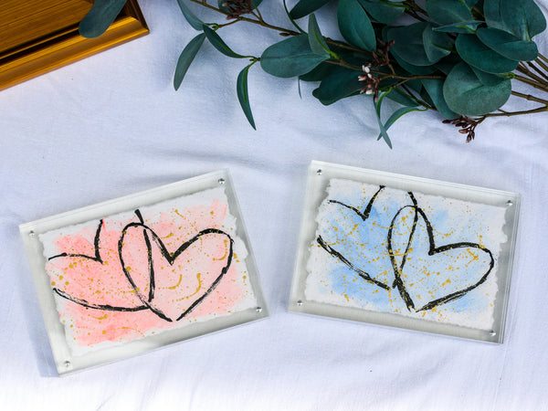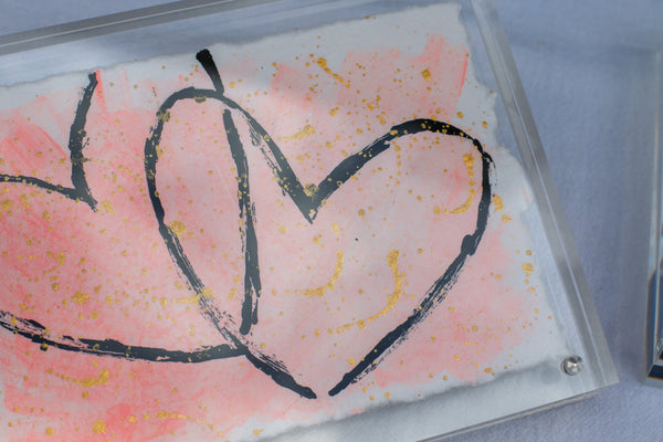 Pale blue or pink acrylic framed hearts feature rich black heart outlines and metallic gold sprinkles.