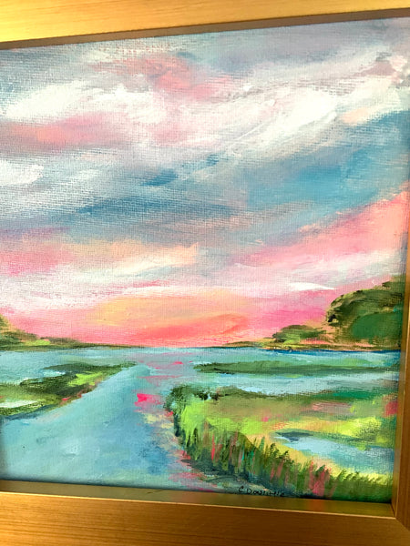 This marsh painting titled "Morning Sun" shows a gorgeous pink sky over the marsh. The 8x8" painting is framed in a 11x11" square, wide gold frame. Ready to hang.