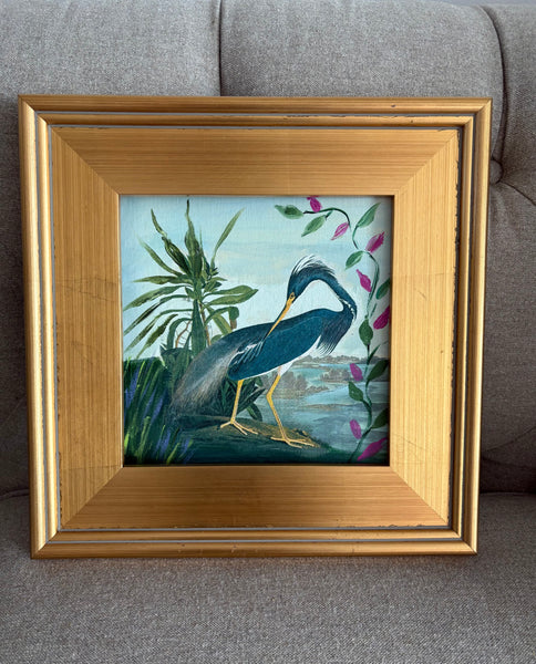 8x8" mixed media Louisiana heron in a 13x13" wide gold frame.