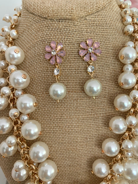 Fancy 19"pearl cluster necklace. Shown here with pink 2" crystal drop pearl earrings.
