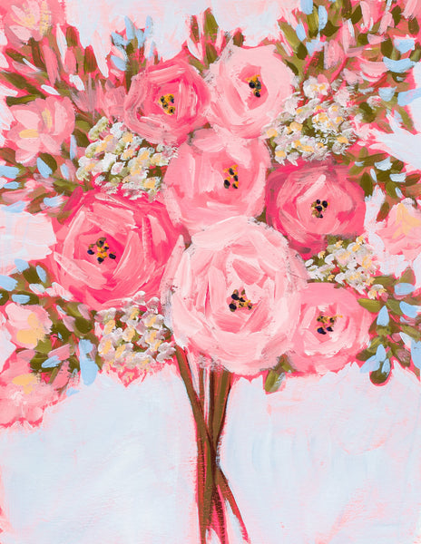 All shades of pink floral bouquet with a pale blue background over a hot pink background that peek through.