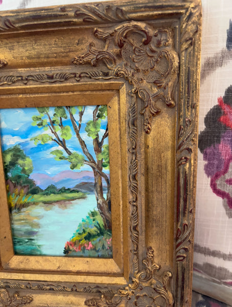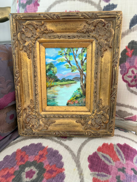 Original 5x7", "River Bank" is a painting of a river scene. It is presented in a ornate gold frame with an exterior measurement of 11x14".