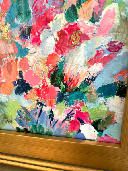Layers of thick paint create this colorful abstract, titled "Living Color". Gold leaf adds sparkle. The 8x10 painting is framed in a 13x15" wide gold frame. Ready to hang.
